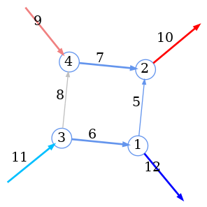 Fig 5.7: The maximal mass spanning tree of the box diagram in blue. The loop momenta are the edges that are missing from the tree.